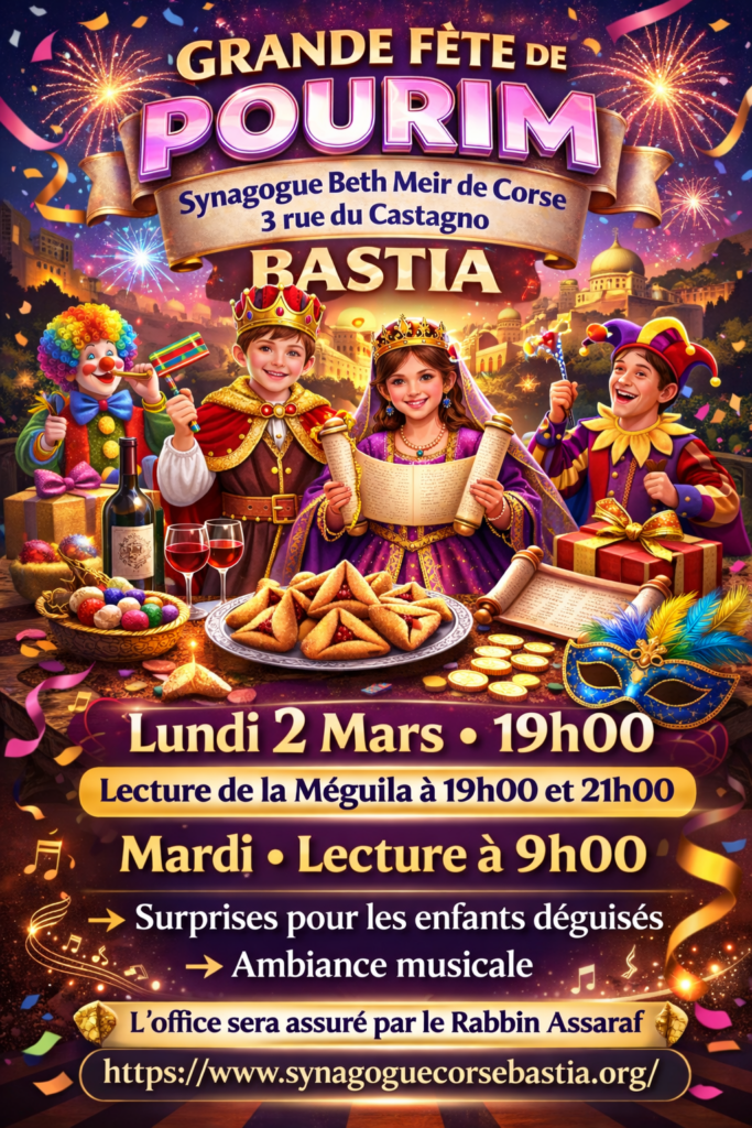 La Grande Fête de Pourim aura lieu à Bastia à la Synagogue Beth Meir de Corse, située 3 rue du Castagno.